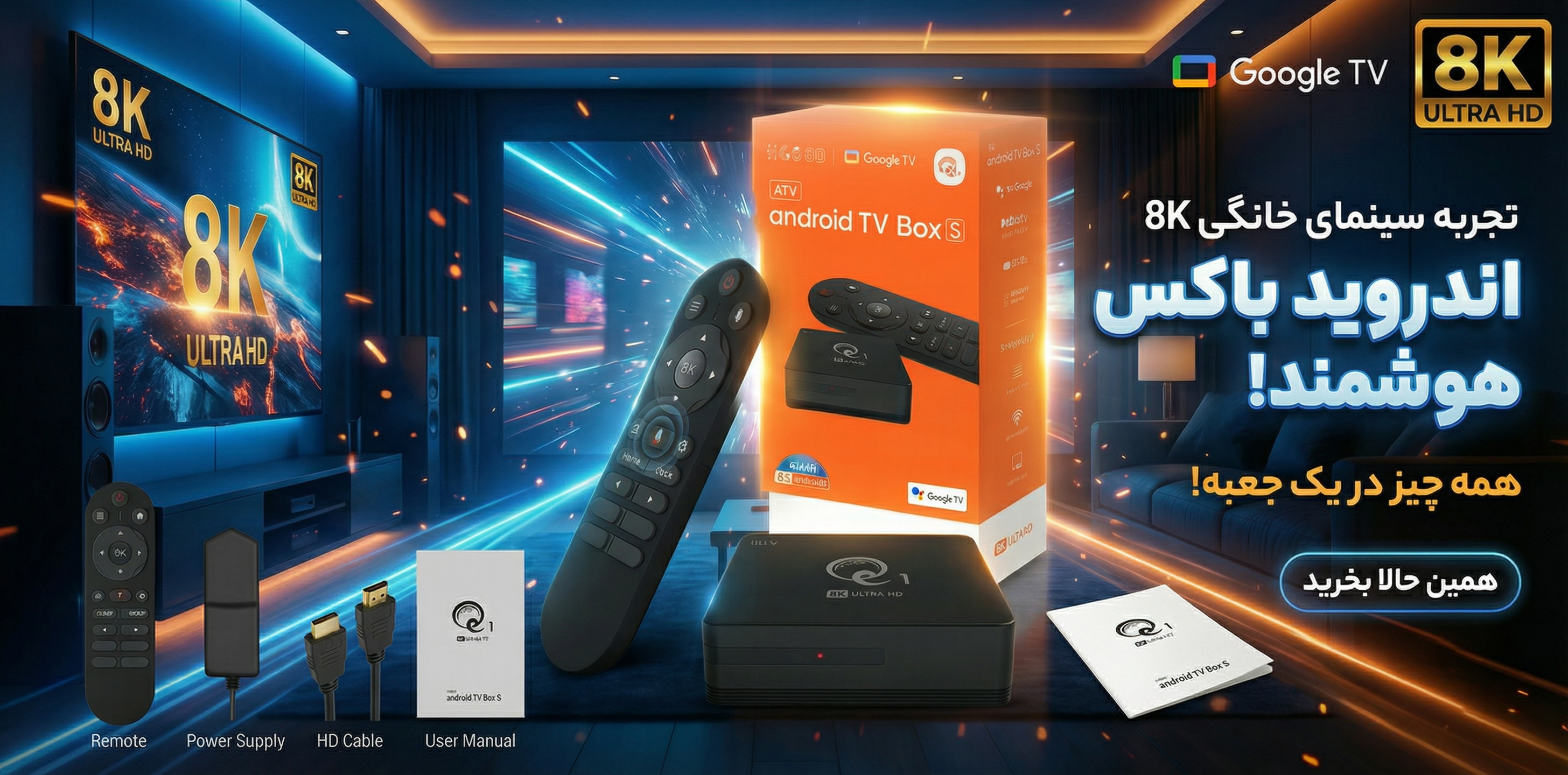 اندروید باکس 8K UHD با اندروید 16، پردازنده چهار هستهای Allwinner H313، رم ۲ گیگابایت، حافظه ۱۶ گیگابایت، بلوتوث، ریموت صوتی و وایفای با پورت شبکه گیگابیتی